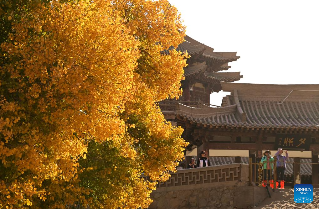 BEIJING, 18 octubre, 2025 (Xinhua) -- Turistas toman fotografías cerca de álamos en el Area Escénica de la Montaña Mingsha y el Manantial de la Luna Creciente, en la ciudad de Dunhuang, en la provincia de Gansu, en el noroeste de China, el 18 de octubre de 2025. (Xinhua/Zhang Xiaoliang)
