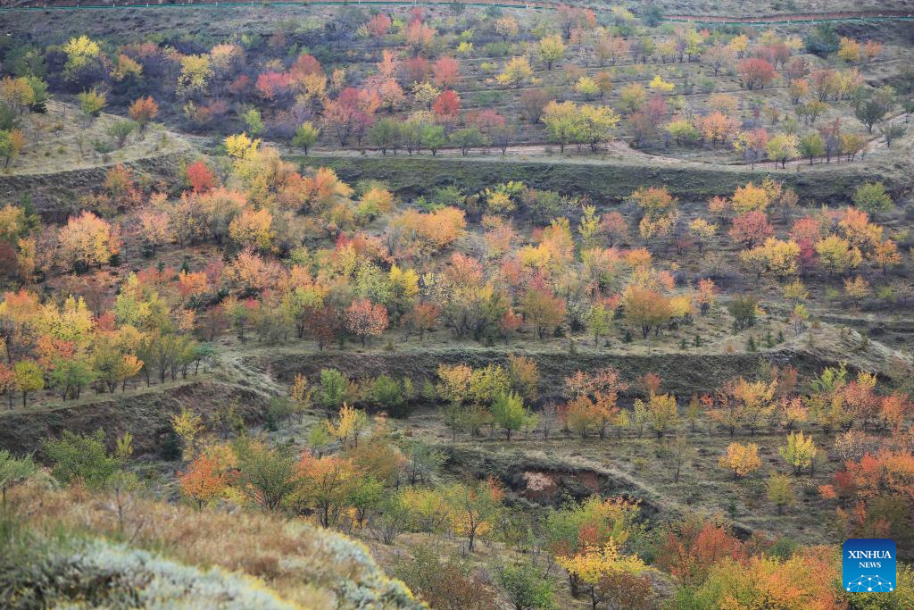 BEIJING, 18 octubre, 2025 (Xinhua) -- Vista aérea tomada con un dron el 18 de octubre de 2025 del paisaje otoñal del poblado de Fengxiang, en el distrito de Anding, en la ciudad de Dingxi, en la provincia de Gansu, en el noroeste de China. (Xinhua/Wang Kexian)