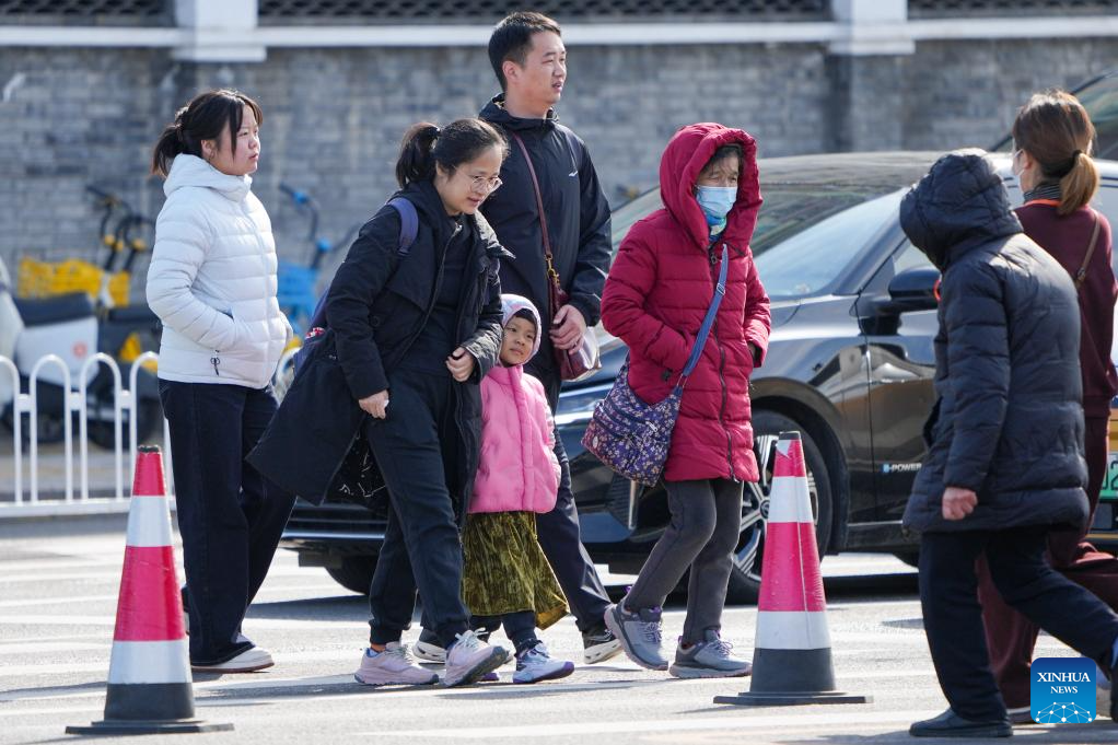 BEIJING, 18 octubre, 2025 (Xinhua) -- Personas portan chaquetas de plumas mientras caminan por una calle, en Beijing, capital de China, el 18 de octubre de 2025. Afectada por un fuerte aire frío, Beijing se ve afectada por una ola de frío. (Xinhua/Ju Huanzong)