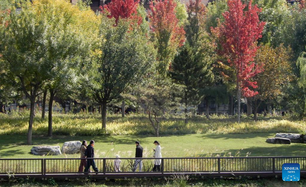 BEIJING, 18 octubre, 2025 (Xinhua) -- Personas portan ropa gruesa mientras caminan a lo largo de un canal, en el distrito de Tongzhou de Beijing, capital de China, el 18 de octubre de 2025. Afectada por un fuerte aire frío, Beijing se ve afectada por una ola de frío. (Xinhua/Li Xin)