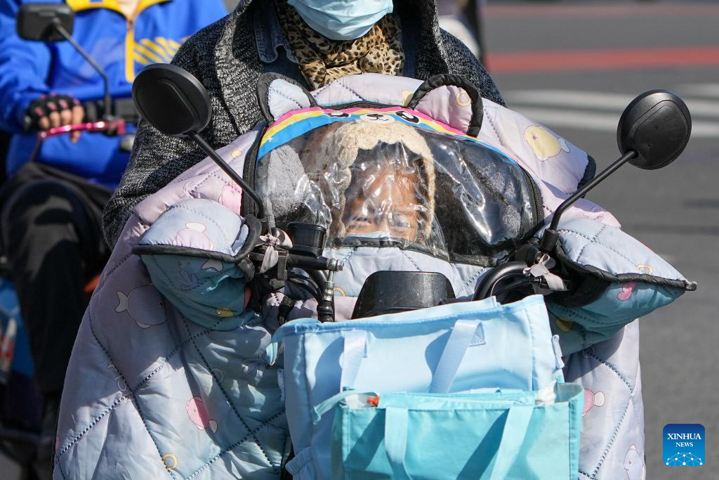 BEIJING, 18 octubre, 2025 (Xinhua) -- Un niño se protege del viento detrás de una cubierta de parabrisas de una motocicleta, en Beijing, capital de China, el 18 de octubre de 2025. Afectada por un fuerte aire frío, Beijing se ve afectada por una ola de frío. (Xinhua/Ju Huanzong)