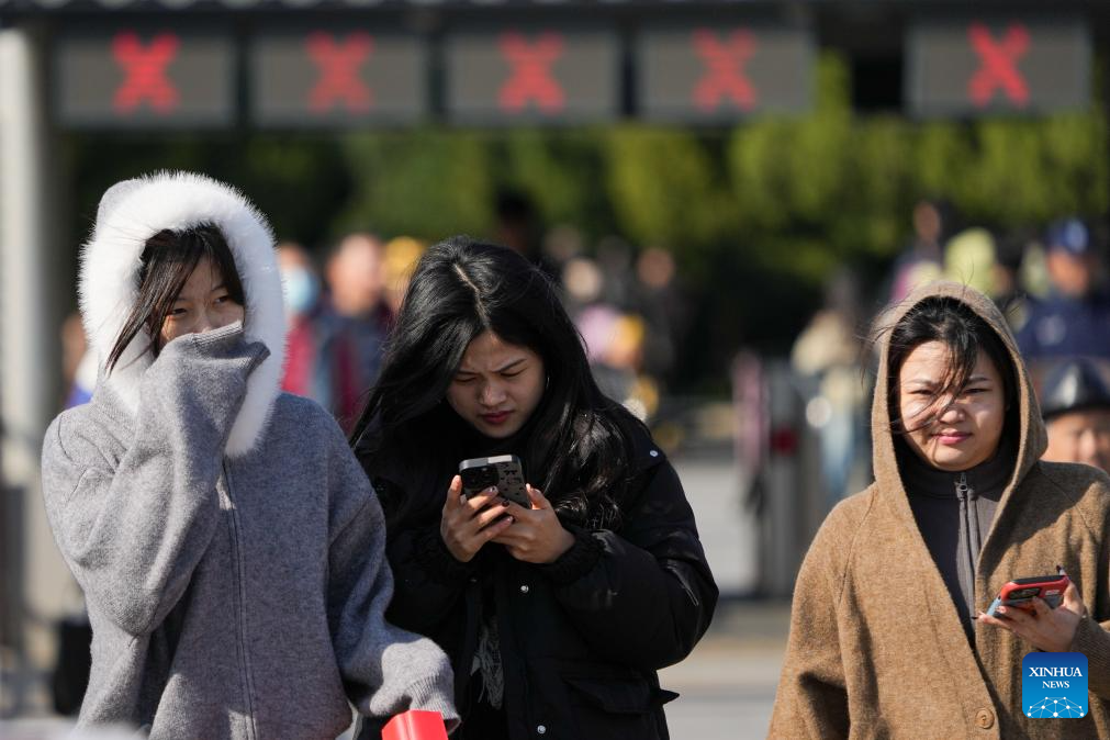 BEIJING, 18 octubre, 2025 (Xinhua) -- Extranjeros portan chaquetas de plumas mientras visitan el Templo del Cielo, en Beijing, capital de China, el 18 de octubre de 2025. Afectada por un fuerte aire frío, Beijing se ve afectada por una ola de frío. (Xinhua/Ju Huanzong)