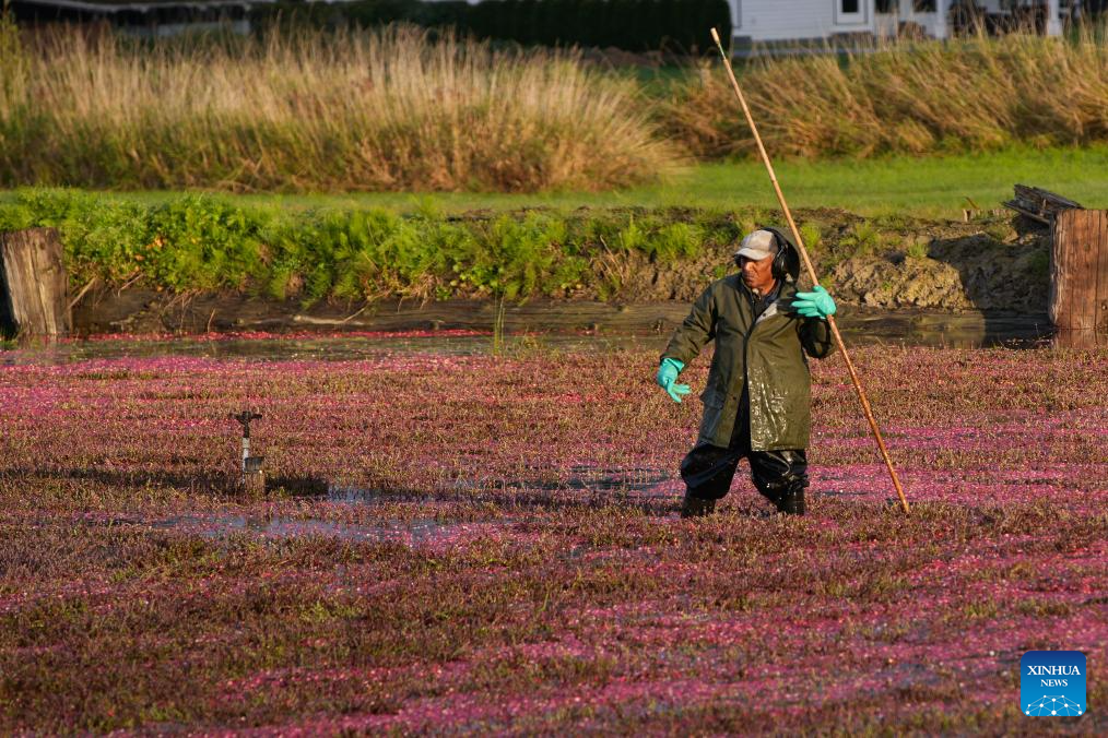 RICHMOND, 18 octubre, 2025 (Xinhua) -- Imagen del 17 de octubre de 2025 de un trabajador vadeando entre arándanos flotantes en una granja de arándanos, en Richmond, Columbia Británica, Canadá. Richmond es una de las principales áreas productoras de arándanos de Canadá, donde la cosecha suele extenderse desde finales de septiembre hasta principios de noviembre. (Xinhua/Liang Sen)
