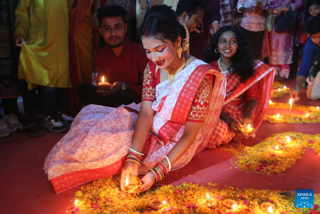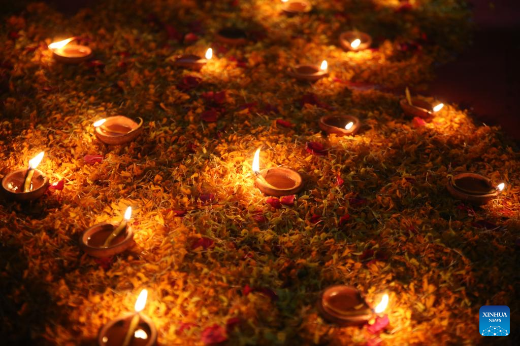 DHAKA, 21 octubre, 2025 (Xinhua) -- Imagen del 20 de octubre de 2025 de lámparas de aceite encendidas para celebrar el Diwali, o el festival hindú de las luces, en un templo, en Dhaka, Bangladesh. (Xinhua/Habibur Rahman)