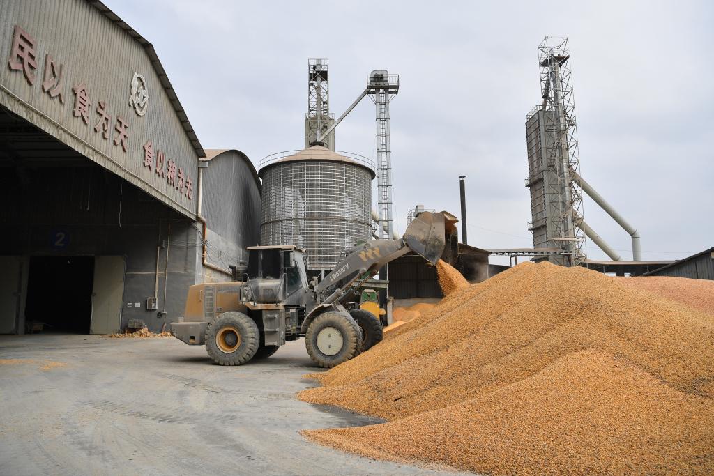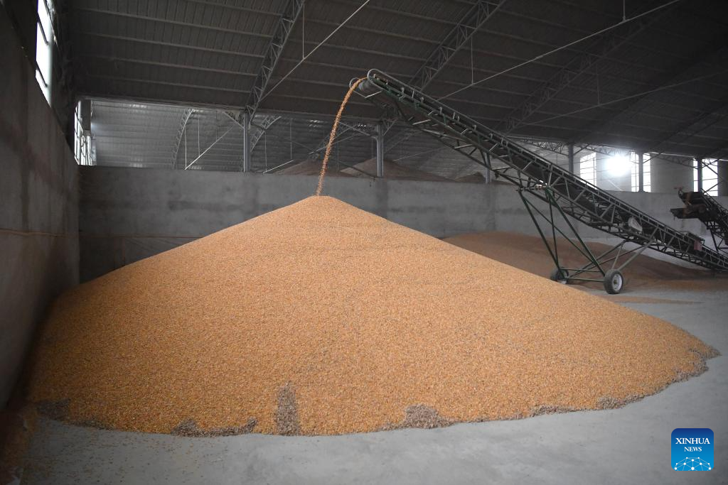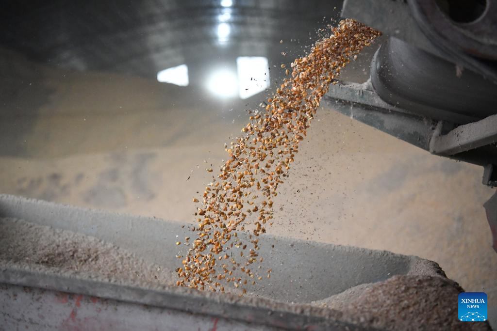 XI'AN, 22 octubre, 2025 (Xinhua) -- Imagen del 20 de octubre de 2025 de los granos siendo almacenados después de ser secados en una estación de compra y secado de cereales de otoño, en la aldea de Sanxing del poblado de Xinyang, en el distrito de Qianxian en la provincia de Shaanxi, en el noroeste de China. Con el fin de hacer frente al continuo tiempo lluvioso en el período crítico actual para la cosecha de cereales de otoño, la provincia de Shaanxi ha enviado cosechadoras sobre orugas, secadoras móviles de cereales, clasificadoras por color y otra maquinaria para mejorar la eficiencia de la cosecha. (Xinhua/Shao Rui)