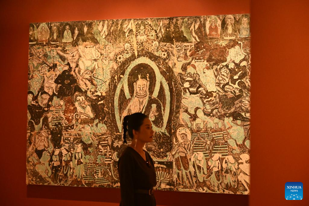 SHANGHAI, 22 octubre, 2025 (Xinhua) -- Una invitada asiste a la vista previa de la Exposición de Beneficencia Pública de Cultura y Arte de Dunhuang, en Shanghai, en el este de China, el 22 de octubre de 2025. La exposición comenzará aquí el 23 de octubre y durará hasta el 31 de marzo de 2026. (Xinhua/Chen Haoming)