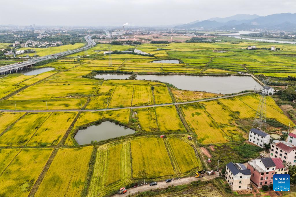 JINHUA, 22 octubre, 2025 (Xinhua) -- Vista aérea tomada con un dron el 22 de octubre de 2025 de una zona de demostración de tierras agrícolas de alta calidad, en el poblado de Tangya del distrito de Jindong, en la ciudad de Jinhua, en la provincia de Zhejiang, en el este de China. (Xinhua/Xu Yu)