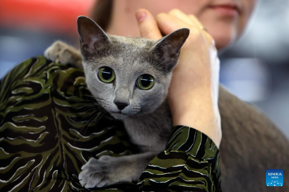 BUCAREST, 26 octubre, 2025 (Xinhua) -- Imagen del 25 de octubre de 2025 de un gato azul ruso siendo evaluado durante el campeonato felino de la Exposición Mundial de Rumanía 2025 en Romexpo, en Bucarest, Rumania. Más de 1.000 gatos de más de 30 países participaron en el concurso de belleza felina, que duró dos días. (Xinhua/Cristian Cristel)