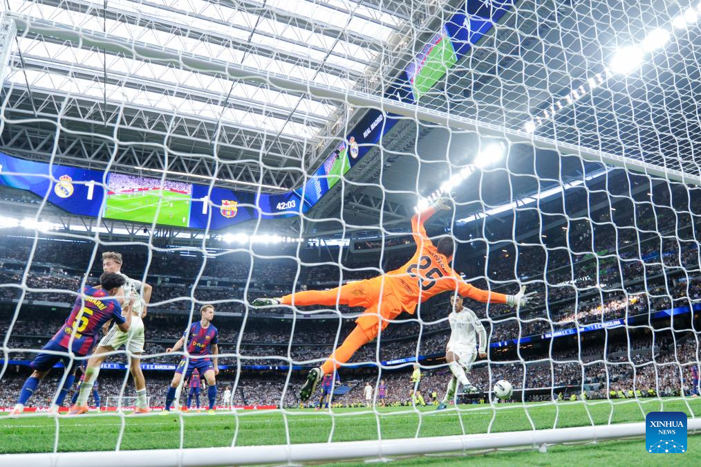 MADRID, 27 octubre, 2025 (Xinhua) -- Imagen del 26 de octubre de 2025 de Jude Bellingham (d), de Real Madrid, realizando una anotación durante el partido de fútbol de LaLiga entre Real Madrid y FC Barcelona, en el Estadio Santiago Bernabéu, en Madrid, España. (Xinhua/Gustavo Valiente)