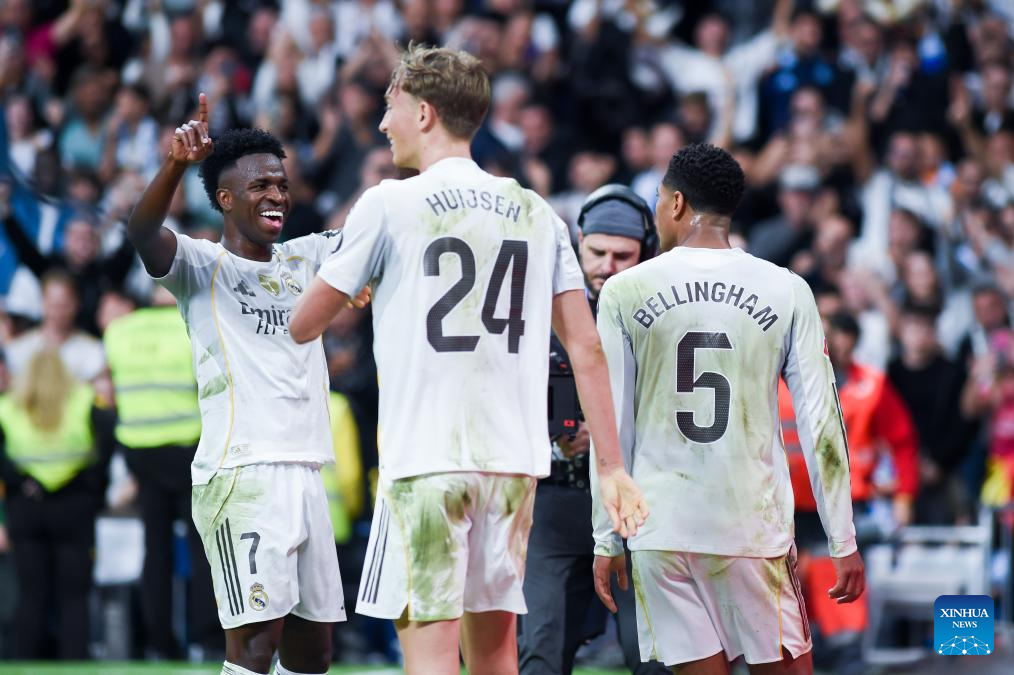 MADRID, 27 octubre, 2025 (Xinhua) -- Imagen del 26 de octubre de 2025 de Vinicius Junior (i), de Real Madrid, festejando una anotación durante el partido de fútbol de LaLiga entre Real Madrid y FC Barcelona, en el Estadio Santiago Bernabéu, en Madrid, España. (Xinhua/Gustavo Valiente)