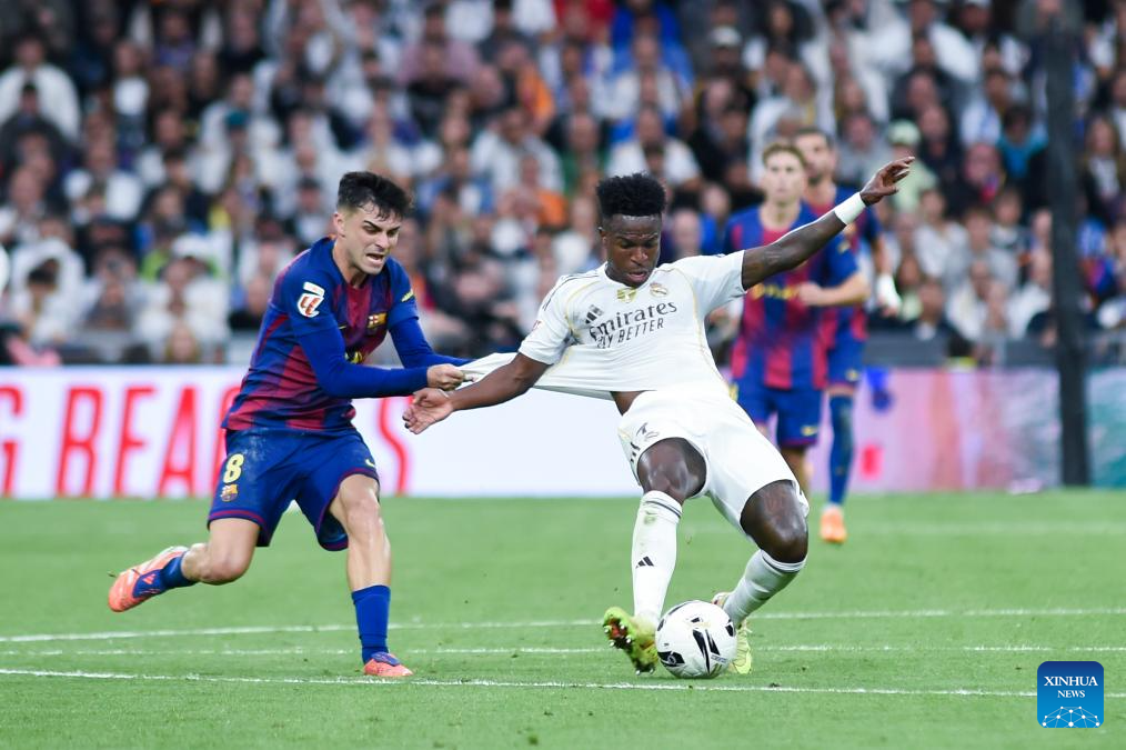 MADRID, 27 octubre, 2025 (Xinhua) -- Imagen del 26 de octubre de 2025 de Vinicius Junior (d), de Real Madrid, disputando el balón con Pedri, de FC Barcelona, durante el partido de fútbol de LaLiga entre Real Madrid y FC Barcelona, en el Estadio Santiago Bernabéu, en Madrid, España. (Xinhua/Gustavo Valiente)