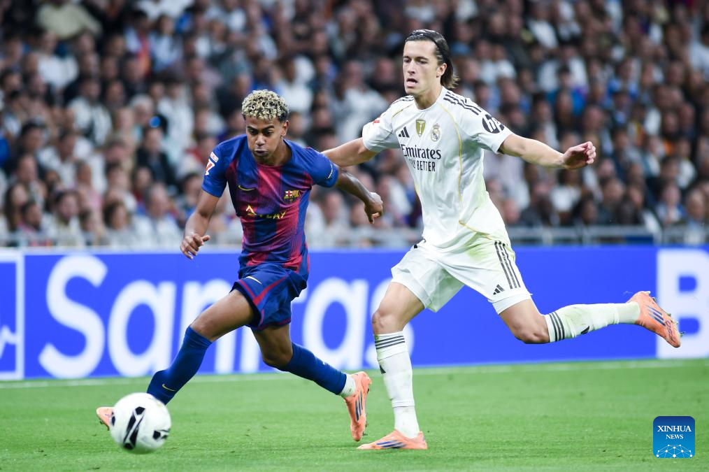MADRID, 27 octubre, 2025 (Xinhua) -- Imagen del 26 de octubre de 2025 de Alvaro Carreras (d), de Real Madrid, disputando el balón con Lamine Yamal, de FC Barcelona, durante el partido de fútbol de LaLiga entre Real Madrid y FC Barcelona, en el Estadio Santiago Bernabéu, en Madrid, España. (Xinhua/Gustavo Valiente)