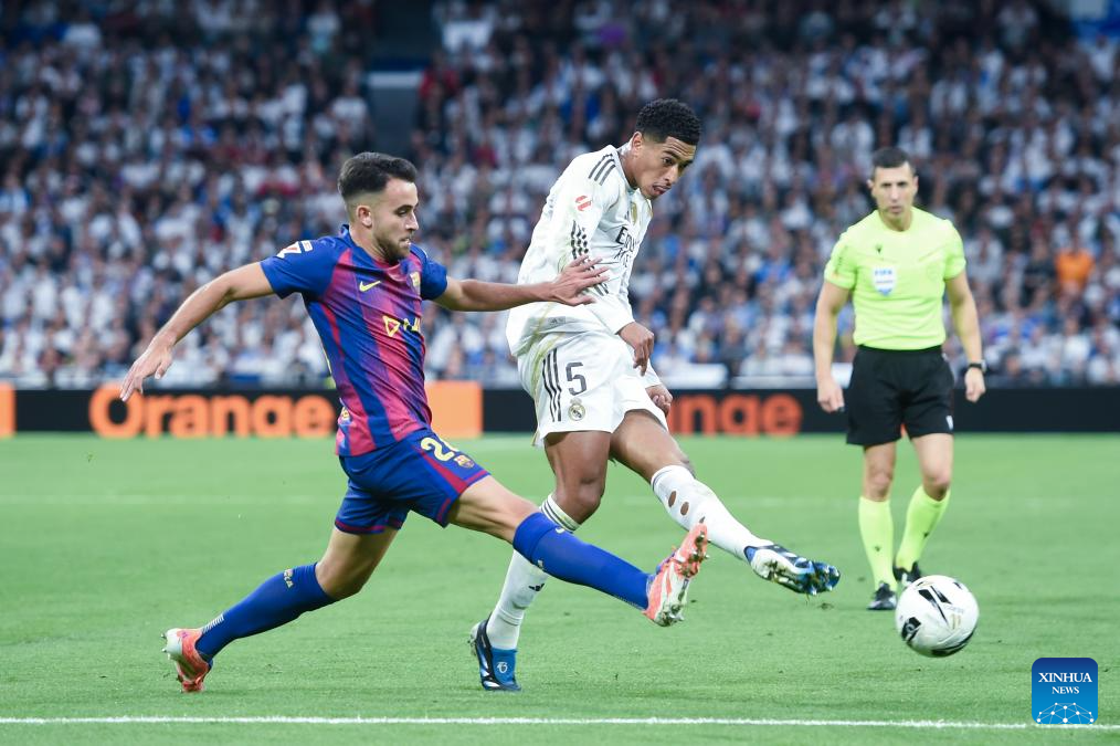 MADRID, 27 octubre, 2025 (Xinhua) -- Imagen del 26 de octubre de 2025 de Jude Bellingham (c), de Real Madrid, disputando el balón con Eric García, de FC Barcelona, durante el partido de fútbol de LaLiga entre Real Madrid y FC Barcelona, en el Estadio Santiago Bernabéu, en Madrid, España. (Xinhua/Gustavo Valiente)