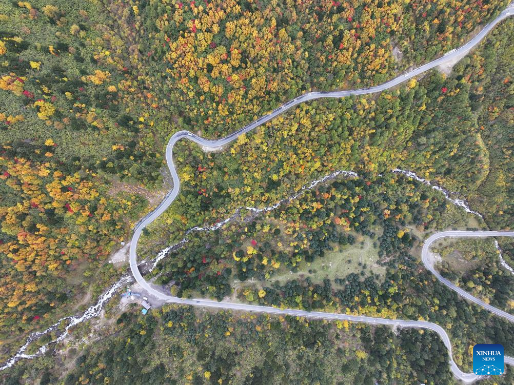 NYINGCHI, 28 octubre, 2025 (Xinhua) -- Vista aérea tomada con un dron el 28 de octubre de 2025 del paisaje de otoño de la montaña Serkyim La, en Nyingchi, en la región autónoma de Xizang, en el suroeste de China. (Xinhua/Lu Danyang)