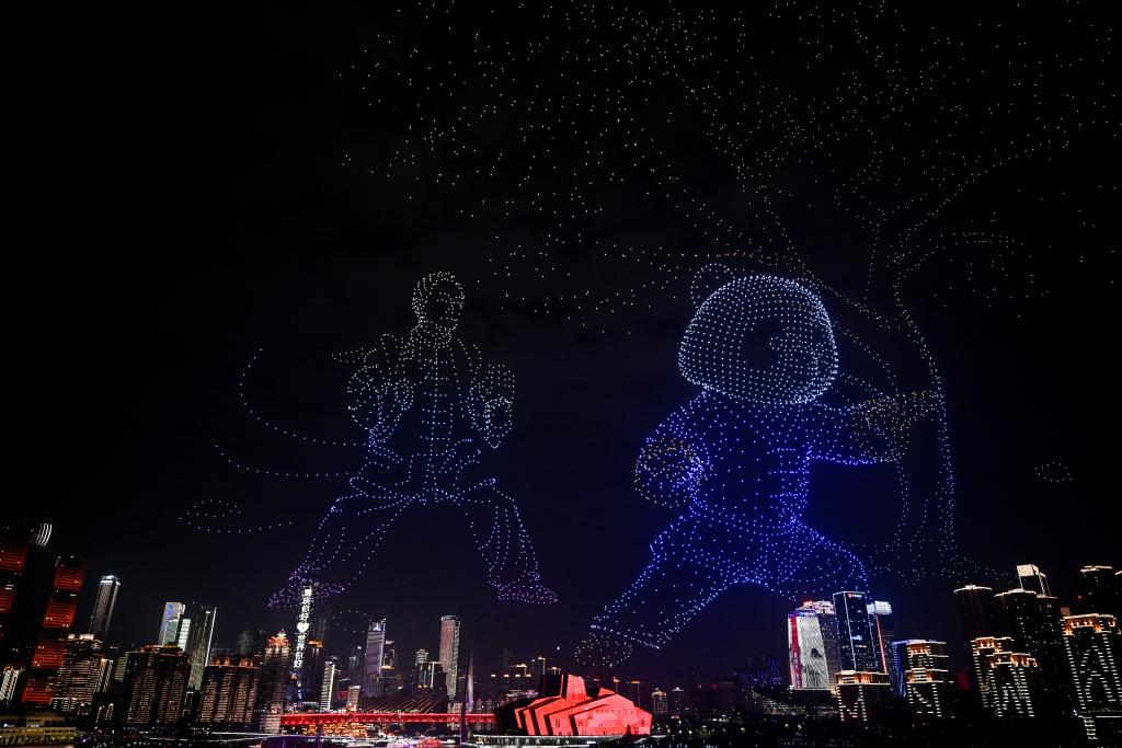 CHONGQING, 28 octubre, 2025 (Xinhua) -- Imagen del 27 de octubre de 2025 de un espectáculo de luz con drones, en el distrito de Nan'an de la municipalidad de Chongqing, en el suroeste de China. Un gran espectáculo de luz con drones bajo el lema "Ciudades inteligentes centradas en las personas hacia el futuro", se celebró aquí el lunes como evento especial para la celebración del Día Mundial de las Ciudades 2025 en China. (Xinhua/Chen Cheng)