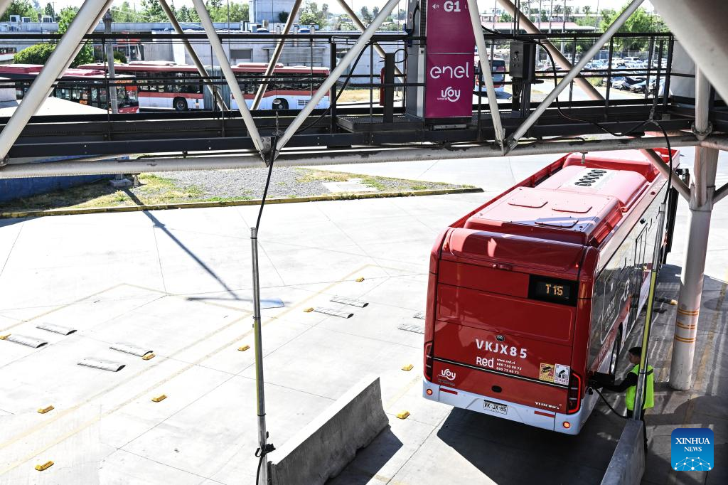 Imagen del 20 de octuchileno bre de 2025 de un trabajador cargando un autobús eléctrico chino, en el electroterminal El Conquistador, en la comuna de Maipú, en Santiago, capital de Chile. La electromovilidad en el transporte público es una de las postales del país sudamericano en el mundo y lo ha logrado gracias al trabajo hecho entre los sectores públicos y privados, quienes han utilizado la tecnología china para desarrollarla, un ejemplo de colaboración en el Asia-Pacífico para avanzar en el cuidado de las personas y el medio ambiente. (Xinhua/Jorge Villegas)