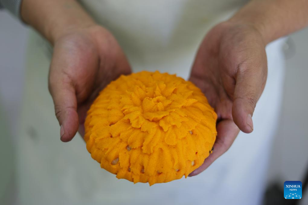 CIUDAD DE MEXICO, 29 octubre, 2025 (Xinhua) -- Imagen del 27 de octubre de 2025 del repostero mexicano, Jonathan Barrera, mostrando una "concha", un pan dulce tradicional mexicano con una cobertura azucarada, que elaboró utilizando una base de "pan de muerto" con motivo del próximo Día de Muertos, en su taller, en la Ciudad de México, capital de México. Desde su taller, el repostero reinterpreta el "pan de muerto" con diseños inspirados en el Mictlán, inframundo al que llegan las almas después de morir, según la tradición mexica. El Día de Muertos se celebra el 1 y 2 de noviembre en México. (Xinhua/Francisco Cañedo)