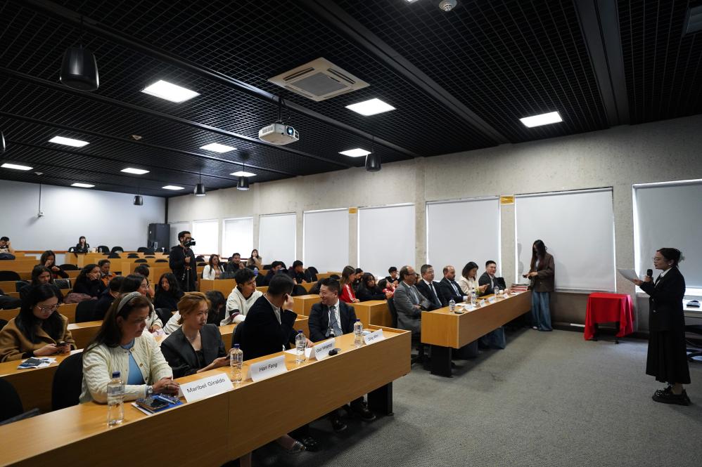 Imagen del 30 de octubre de 2025 de estudiantes y directivos asistiendo a un foro en el marco del Día Mundial de las Ciudades, en la Universidad Jorge Tadeo Lozano, en Bogotá, capital de Colombia. Analistas y expertos en urbanización se dieron cita en la Universidad Jorge Tadeo Lozano de Bogotá en el marco del Día Mundial de las Ciudades, ocasión que sirvió para que especialistas chinos y colombianos intercambiaran opiniones sobre el urbanismo. (Xinhua/Andrés Moreno)