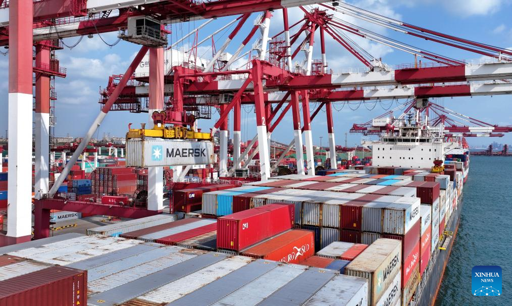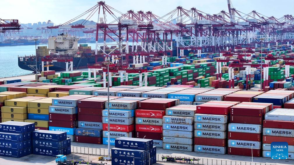 QINGDAO, 30 octubre, 2025 (Xinhua) -- Imagen tomada con dron del 29 de octubre de 2025 del puerto de Qingdao, en Qingdao, en la provincia de Shandong, en el este de China. Como centro de comercio marítimo, el puerto de Qingdao ha aprovechado su proximidad a Japón y República de Corea mientras se esfuerza por construir una red logística que abarque los principales puertos de ambos países. (Xinhua/Li Ziheng)