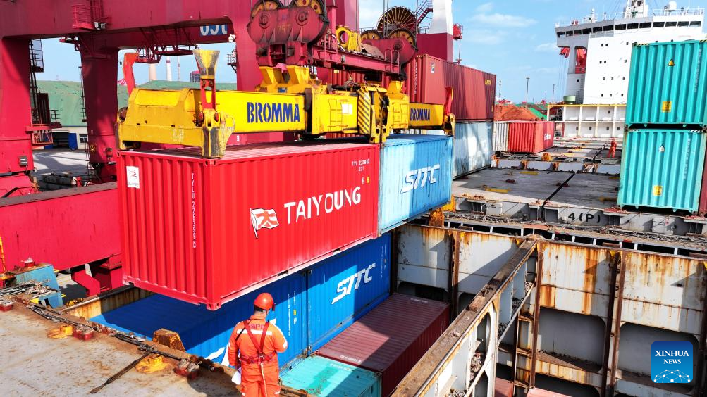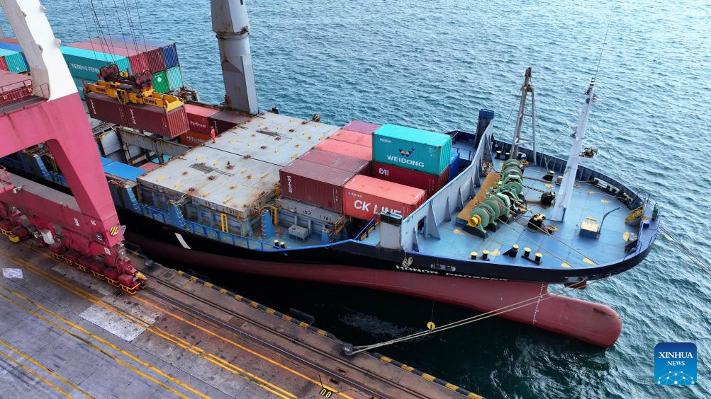 QINGDAO, 30 octubre, 2025 (Xinhua) -- Imagen tomada con dron del 29 de octubre de 2025 de un buque de carga con destino al puerto de Incheon, en República de Corea, en el puerto de Qingdao, en Qingdao, en la provincia de Shandong, en el este de China. Como centro de comercio marítimo, el puerto de Qingdao ha aprovechado su proximidad a Japón y República de Corea mientras se esfuerza por construir una red logística que abarque los principales puertos de ambos países. (Xinhua/Li Ziheng)