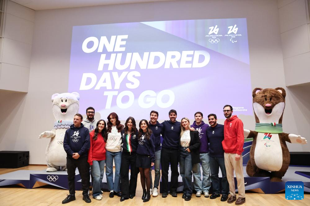 MILAN, 30 octubre, 2025 (Xinhua) -- Imagen del 29 de octubre de 2025 de los doce "portadores de la antorcha digital" posando junto a las mascotas Tina y Milo de los Juegos Olímpicos y Paralímpicos de Milán Cortina 2025, y con los podios recién develados durante una ceremonia para marcar los 100 días para la inauguración de los Juegos Olímpicos de Invierno de Milán Cortina 2026, en el Palazzo Lombardia, en Milán, Italia. Una ceremonia para marcar los 100 días para la inauguración de los Juegos Olímpicos de Invierno de Milán Cortina 2026 se llevó a cabo en el Palazzo Lombardia en Milán, en donde los organizadores develaron los podios oficiales de los Juegos Olímpicos y Paralímpicos y presentaron a 12 "portadores de la antorcha digital", que simboliza el inicio de la etapa final de los preparativos para el evento. (Xinhua/Li Jing)