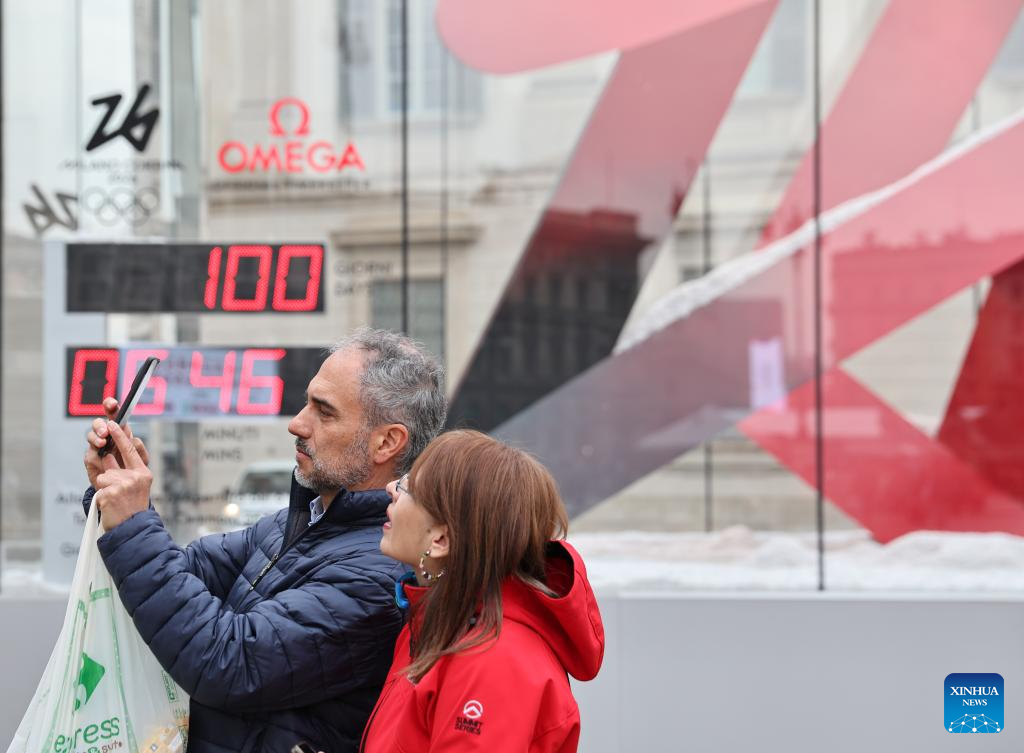 MILAN, 30 octubre, 2025 (Xinhua) -- Imagen del 29 de octubre de 2025 de personas posando para fotografías junto al contador de la cuenta regresiva digital de los Juegos Olímpicos de Milán Cortina 2026, en Milán, Italia. Una ceremonia para marcar los 100 días para la inauguración de los Juegos Olímpicos de Invierno de Milán Cortina 2026 se llevó a cabo en el Palazzo Lombardia en Milán, en donde los organizadores develaron los podios oficiales de los Juegos Olímpicos y Paralímpicos y presentaron a 12 "portadores de la antorcha digital", que simboliza el inicio de la etapa final de los preparativos para el evento. (Xinhua/Li Jing)