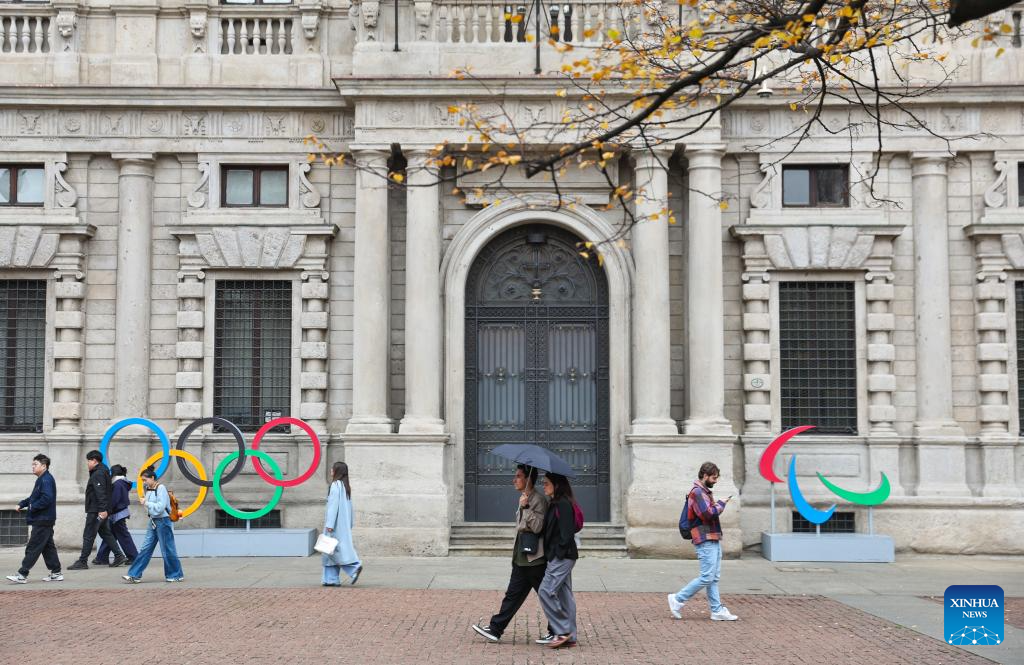 MILAN, 30 octubre, 2025 (Xinhua) -- Imagen del 29 de octubre de 2025 de personas caminando frente a los emblemas de los Juegos Olímpicos y Paralímpicos frente al Ayuntamiento de Milán, en Milán Italia. Una ceremonia para marcar los 100 días para la inauguración de los Juegos Olímpicos de Invierno de Milán Cortina 2026 se llevó a cabo en el Palazzo Lombardia en Milán, en donde los organizadores develaron los podios oficiales de los Juegos Olímpicos y Paralímpicos y presentaron a 12 "portadores de la antorcha digital", que simboliza el inicio de la etapa final de los preparativos para el evento. (Xinhua/Li Jing)
