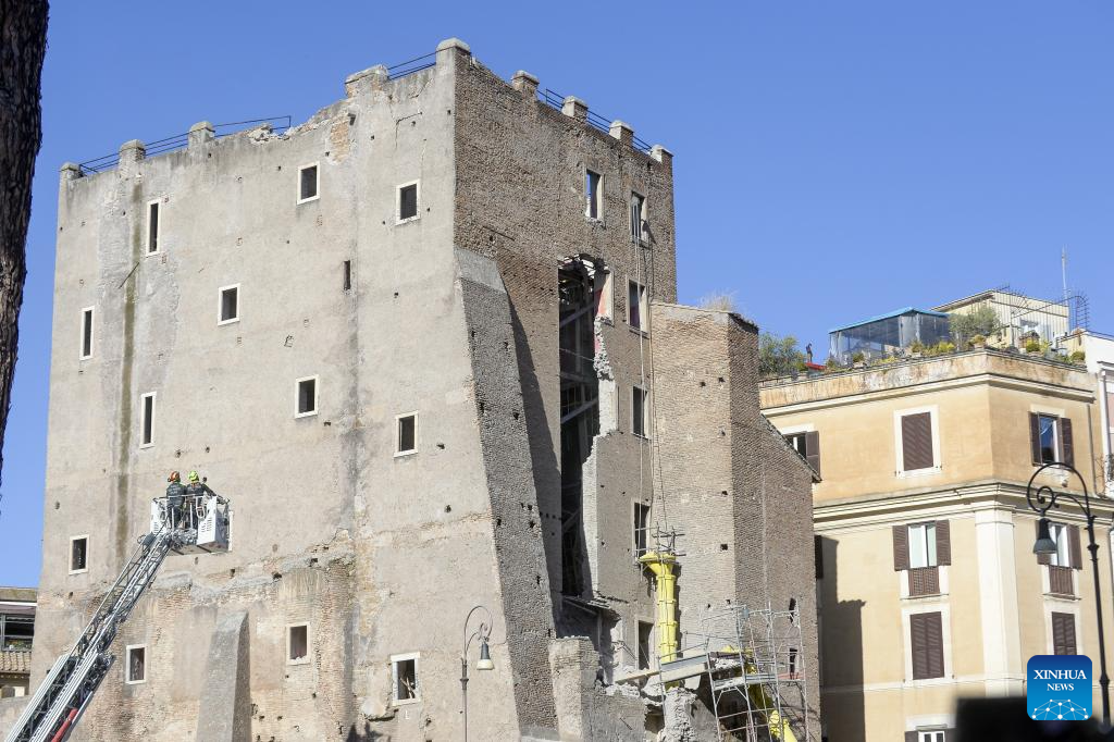 ROMA, 3 noviembre, 2025 (Xinhua) -- Bomberos trabajan en el sitio después de que una sección de la Torre dei Conti, una torre medieval actualmente en restauración, se derrumbara, en el centro de Roma, Italia, el 3 de noviembre de 2025. Una sección de la Torre dei Conti se derrumbó el lunes, hiriendo a cuatro trabajadores de la construcción y desencadenando una operación de rescate de emergencia, informaron medios locales. (Xinhua/Alberto Lingria)