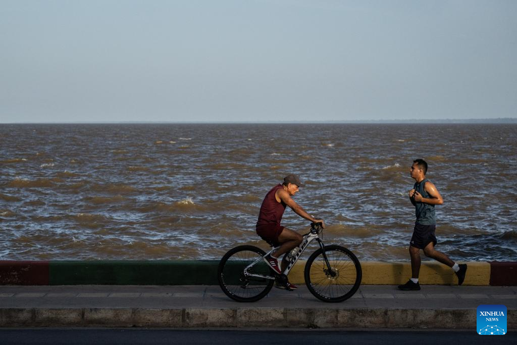 AMAPA, 10 noviembre, 2025 (Xinhua) -- Imagen del 9 de noviembre de 2025 de personas ejercitándose a lo largo del paseo marítimo del río Amazonas, en Macapá, capital del estado de Amapá, Brasil. Hoy, mientras la atención mundial se centra en la conservación del Amazonas, Macapá se erige como un claro ejemplo de armonía entre la vida humana y la naturaleza. (Xinhua/Wang Tiancong)