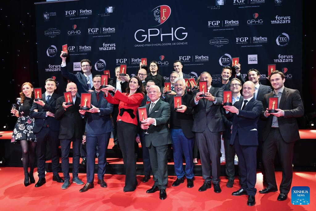 GINEBRA, 14 noviembre, 2025 (Xinhua) -- Imagen del 13 de noviembre de 2025 de Dai Xinyan (c-i), fundador de Fam al Hut, hablando en la ceremonia de premiación del 25 Gran Premio de Relojería de Ginebra (GPHG, por sus siglas en francés), en Ginebra, Suiza. La marca china independiente de relojes Fam al Hut ganó el jueves el Premio Audacity en el 25 GPHG, considerado por muchos como los "Oscar de la Relojería". Esta es la segunda vez que una marca china ha obtenido un premio GPHG. En 2021, la empresa china CIGA Design ganó el Premio Challenge Watch por su modelo original, "el Planeta Azul". (Xinhua/Lian Yi)