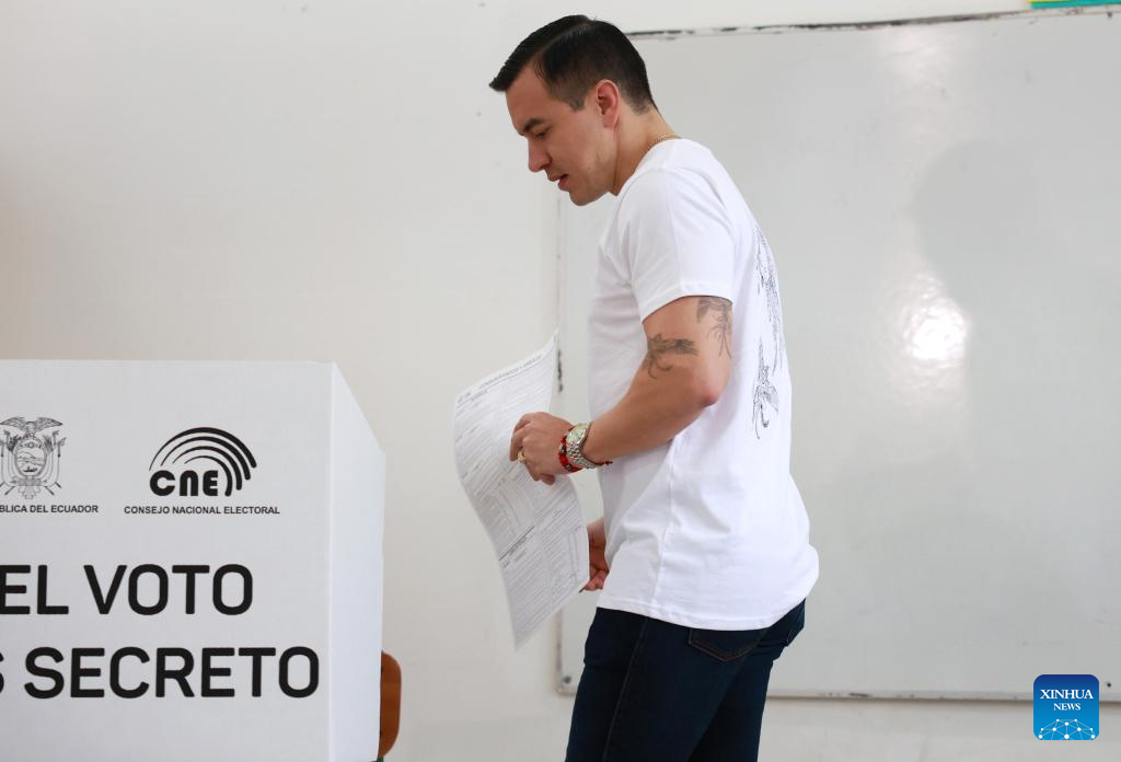 SANTA ELENA, 16 noviembre, 2025 (Xinhua) -- Imagen proveída por la Presidencia de Ecuador del presidente ecuatoriano, Daniel Noboa, emitiendo su voto en un centro electoral durante la jornada electoral, en Olón, en la provincia de Santa Elena, Ecuador, el 16 de noviembre de 2025. Los colegios electorales en Ecuador abrieron el domingo a las 07:00 hora local (12:00 GMT) para las votaciones de la consulta popular y referendo constitucional impulsados por el Gobierno sobre temas políticos y de seguridad nacional. (Xinhua/Isaac Castillo/Presidencia de Ecuador)