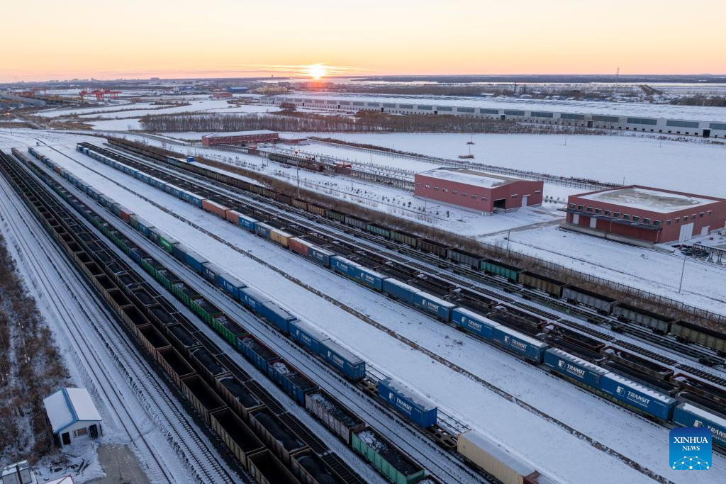HARBIN, 16 noviembre, 2025 (Xinhua) -- Vista aérea tomada con un dron el 16 de noviembre de 2025 de un tren de carga China-Europa partiendo desde el patio de transbordo de la Estación de Ferrocarriles del Norte de Tongjiang, en la ciudad de Tongjiang, en la provincia de Heilongjiang, en el noreste de China. Como parte importante del corredor oriental del servicio de trenes de carga China-Europa, el puerto ferroviario de Tongjiang ha gestionado un total de 273 viajes de trenes de carga China-Europa desde su puesta en marcha en 2022, con más de 14 millones de toneladas de mercancías importadas y exportadas, según datos de China Railway Harbin Group Co., Ltd. (Xinhua/Wu Yunan)