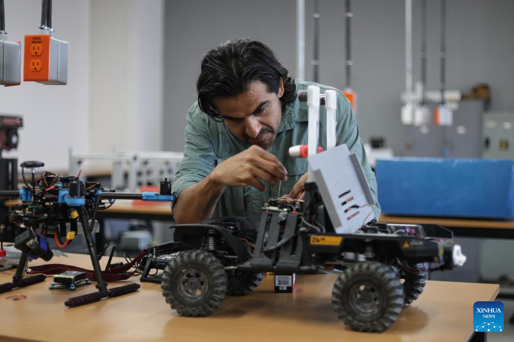 CIUDAD DE MEXICO, 21 noviembre, 2025 (Xinhua) -- Imagen del 19 de noviembre de 2025 del doctor, Rodolfo Vera Amaro, de la Unidad Profesional Interdisciplinaria en Ingeniería y Tecnologías Avanzadas del Instituto Politécnico Nacional (IPN) de México, trabajando en un vehículo robótico (rover), en la Ciudad de México, capital de México. Estudiantes del IPN de México desarrollaron un rover, equipado con redes neuronales y visión artificial, capaz de identificar riesgos geológicos, detectar condiciones extremas y reconocer la presencia de gases tóxicos en zonas mineras. (Xinhua/Francisco Cañedo)