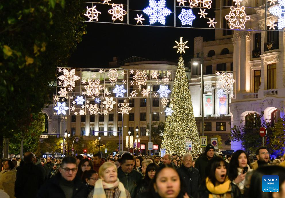 MADRID, 23 noviembre, 2025 (Xinhua) -- Imagen del 22 de noviembre de 2025 de personas disfrutando de la iluminación festiva en una calle, en Madrid, España. Madrid celebró el sábado una ceremonia de encendido navideño con un espectáculo de luces proyectadas. (Xinhua/Cheng Min)