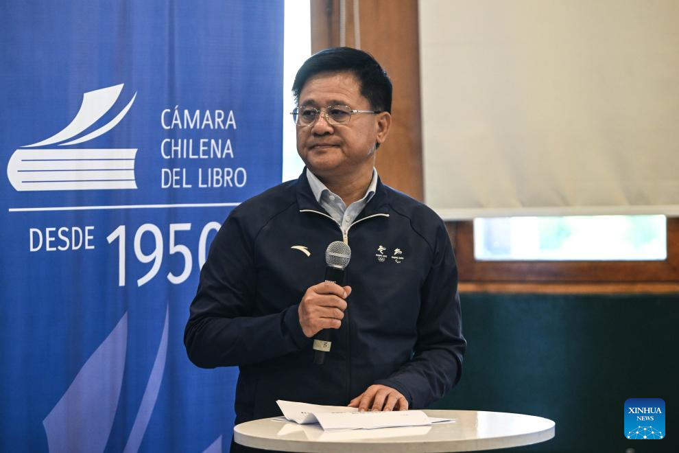 Imagen del 24 de noviembre de 2025 del embajador chino en Chile, Niu Qingbao (d-atrás), pronunciando un discurso durante un conversatorio titulado "Encuentro con Beijing: traducción al español de autores de Beijing" en el marco de la 44ª Feria Internacional del Libro de Santiago (Filsa), en el Centro Cultural Estación Mapocho, en Santiago, capital de Chile. Un grupo de escritores chinos y chilenos intercambió experiencias y visiones en un conversatorio realizado el lunes en el marco de la 44ª Filsa, que se lleva a cabo en la capital chilena hasta el 30 de noviembre. (Xinhua/Jorge Villegas)