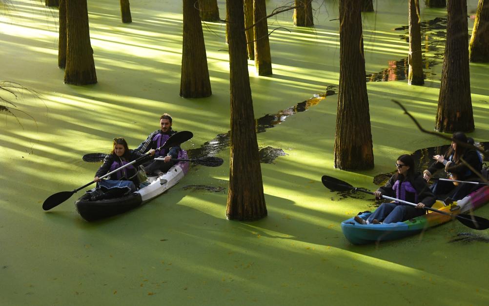 HANGZHOU, 28 noviembre, 2025 (Xinhua) -- Turistas reman a través de un bosque anegado en el punto escénico del lago Qingshan, en el distrito de Lin'an de la ciudad de Hangzhou, en la provincia de Zhejiang, en el este de China, el 28 de noviembre de 2025. El lago Qingshan, un lago artificial en el distrito de Lin'an de la ciudad de Hangzhou, es conocido por su bosque anegado. (Xinhua/Weng Xinyang)