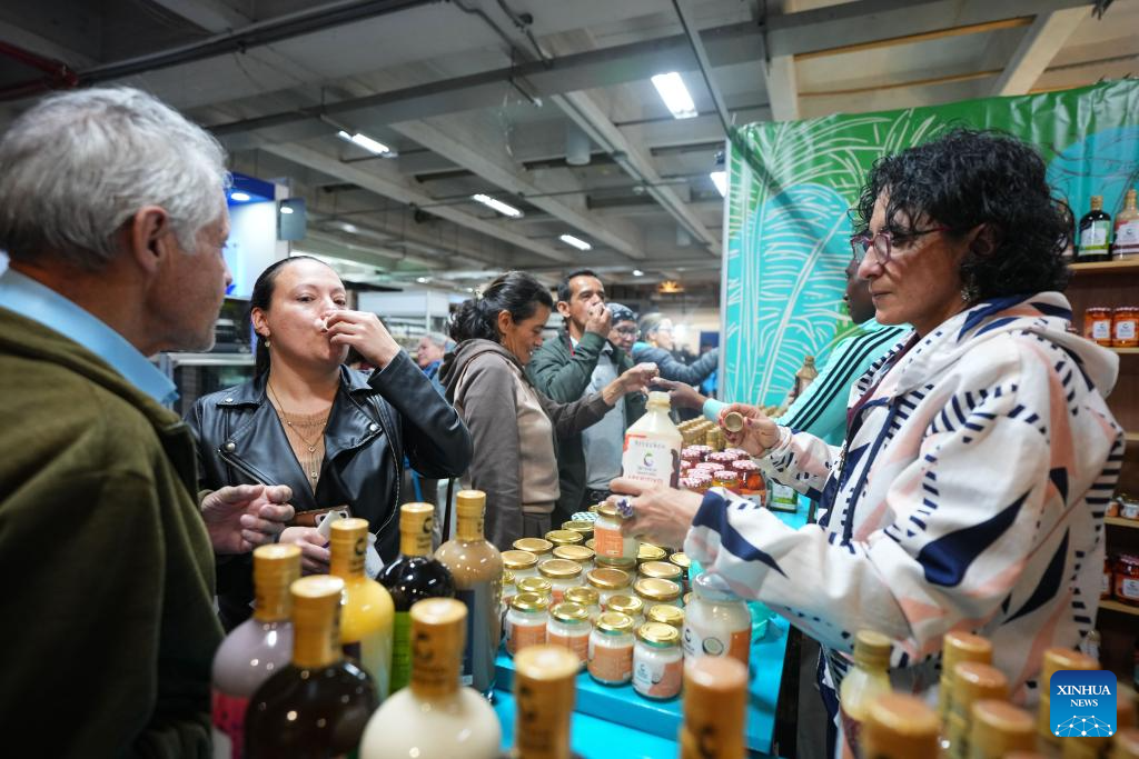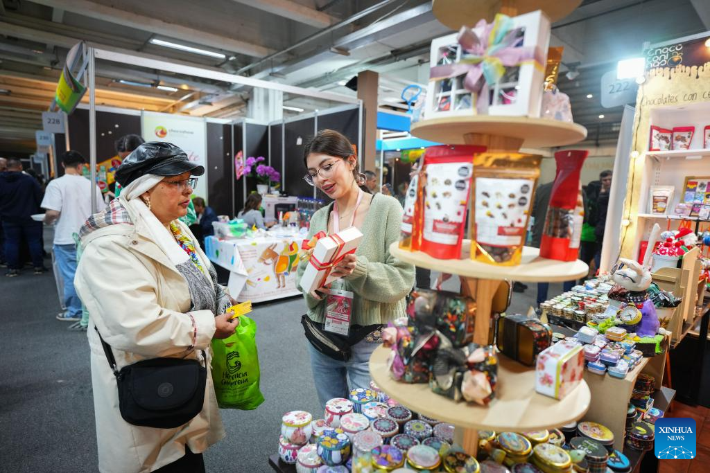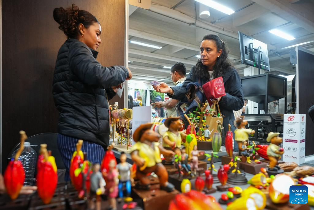 Imagen del 28 de noviembre de 2025 de una mujer observado productos en un estand durante la feria Chocoshow, en Bogotá, capital de Colombia. Los productores de cacao de Colombia celebran la pronta entrada de su producto al mercado chino, tras el éxito alcanzado en las negociaciones en la VIII Exposición Internacional de Importaciones de China (CIIE), realizada a comienzos de noviembre en Shanghai. (Xinhua/Andrés Moreno)