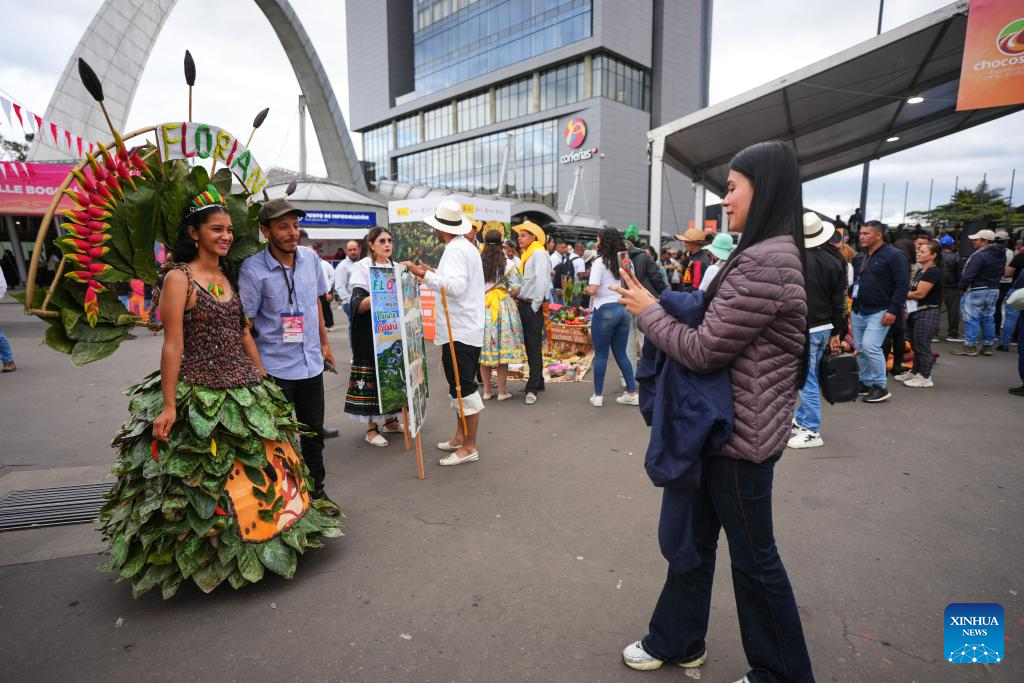 Imagen del 28 de noviembre de 2025 de una mujer sosteniendo una decoración de frutos y hojas de cacao durante la feria Chocoshow, en Bogotá, capital de Colombia. Los productores de cacao de Colombia celebran la pronta entrada de su producto al mercado chino, tras el éxito alcanzado en las negociaciones en la VIII Exposición Internacional de Importaciones de China (CIIE), realizada a comienzos de noviembre en Shanghai. (Xinhua/Andrés Moreno)