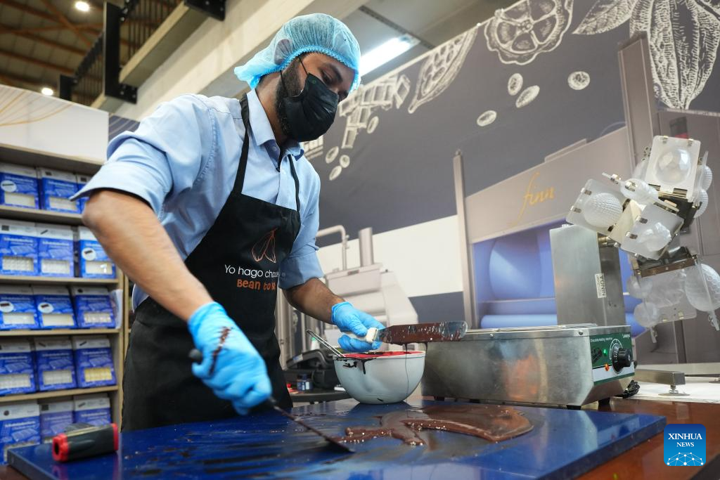 Imagen del 28 de noviembre de 2025 de una persona elaborando una preparación con cacao durante la feria Chocoshow, en Bogotá, capital de Colombia. Los productores de cacao de Colombia celebran la pronta entrada de su producto al mercado chino, tras el éxito alcanzado en las negociaciones en la VIII Exposición Internacional de Importaciones de China (CIIE), realizada a comienzos de noviembre en Shanghai. (Xinhua/Andrés Moreno)