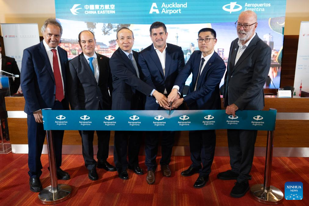 EZEIZA, 5 diciembre, 2025 (Xinhua) -- (De izq. a der.) Imagen del 4 de diciembre de 2025 del secretario de Turismo y Ambiente argentino, Daniel Scioli, el embajador de Argentina en China, Marcelo Suárez Salvia, el embajador de China en Argentina, Wang Wei, el director ejecutivo de Aeropuertos Argentina, Daniel Ketchibachian, el presidente de China Eastern Airlines, Gao Fei, y el alcalde de Auckland, Wayne Brown, participando durante el acto inaugural del primer vuelo directo entre China y Argentina operado por China Eastern Airlines, en el Aeropuerto Internacional de Ezeiza, en Buenos Aires, Argentina. El primer vuelo directo entre China y Argentina aterrizó el jueves en el Aeropuerto Internacional de Ezeiza, en Buenos Aires, lo que significa un nuevo puente entre ambos países y la apertura de nuevas oportunidades para los sectores turístico, comercial y empresarial. (Xinhua/Martín Zabala)