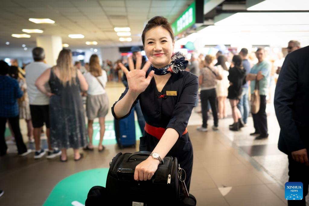 EZEIZA, 5 diciembre, 2025 (Xinhua) -- Imagen del 4 de diciembre de 2025 de una sobrecargo de China Eastern Airlines saludando durante la llegada del primer vuelo directo entre China y Argentina operado por China Eastern Airlines, en el Aeropuerto Internacional de Ezeiza, en Buenos Aires, Argentina. El primer vuelo directo entre China y Argentina aterrizó el jueves en el Aeropuerto Internacional de Ezeiza, en Buenos Aires, lo que significa un nuevo puente entre ambos países y la apertura de nuevas oportunidades para los sectores turístico, comercial y empresarial. (Xinhua/Martín Zabala)