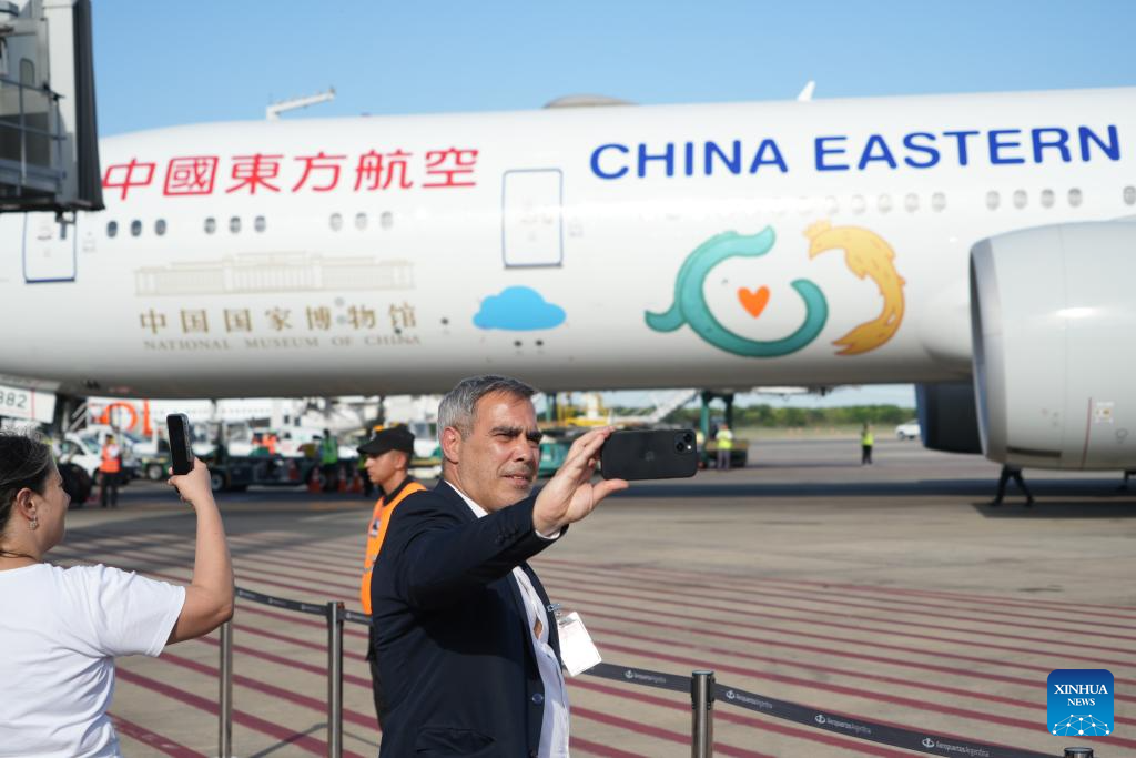 La aeronave que aterrizó en Buenos Aires es un avión de fuselaje ancho Boeing 777, cuya rotulación fue diseñada de manera conjunta por China Eastern Airlines y el Museo Nacional de China con imágenes de seis objetos preciosos que forman parte de la colección del museo.