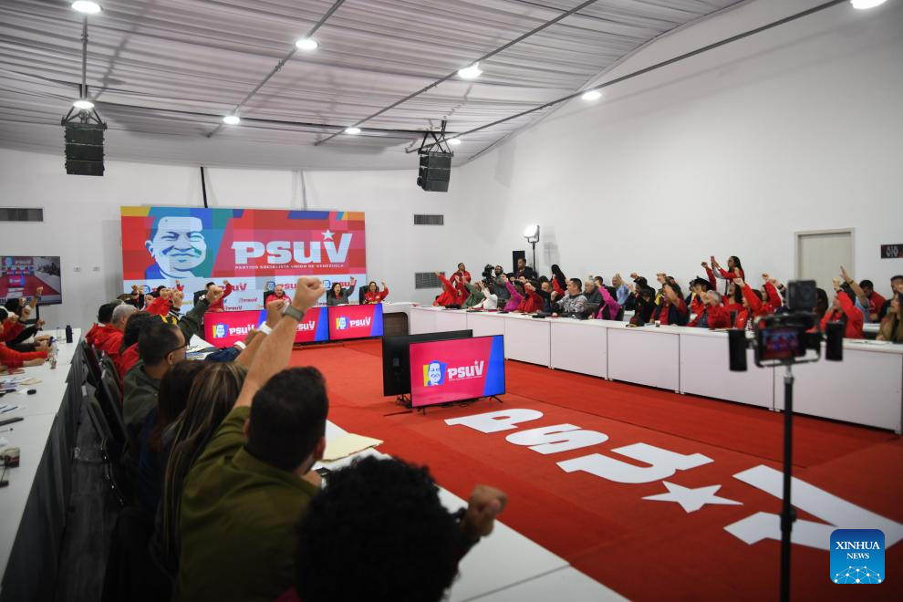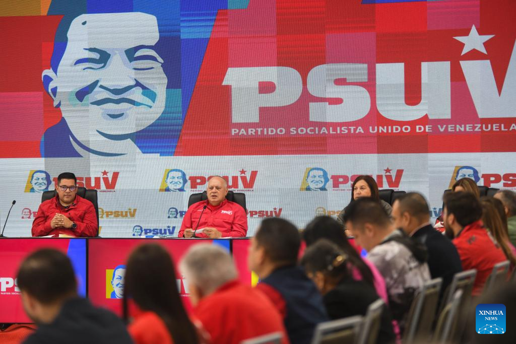 Miembros de la directiva del Partido Socialista Unido de Venezuela (PSUV) participan en una conferencia de prensa, en el estado de Miranda, Venezuela, el 8 de diciembre de 2025. El secretario general del PSUV, Diosdado Cabello agradeció el lunes el respaldo internacional al país sudamericano ante la amenaza militar de Estados Unidos. (Xinhua/Marcos Salgado)