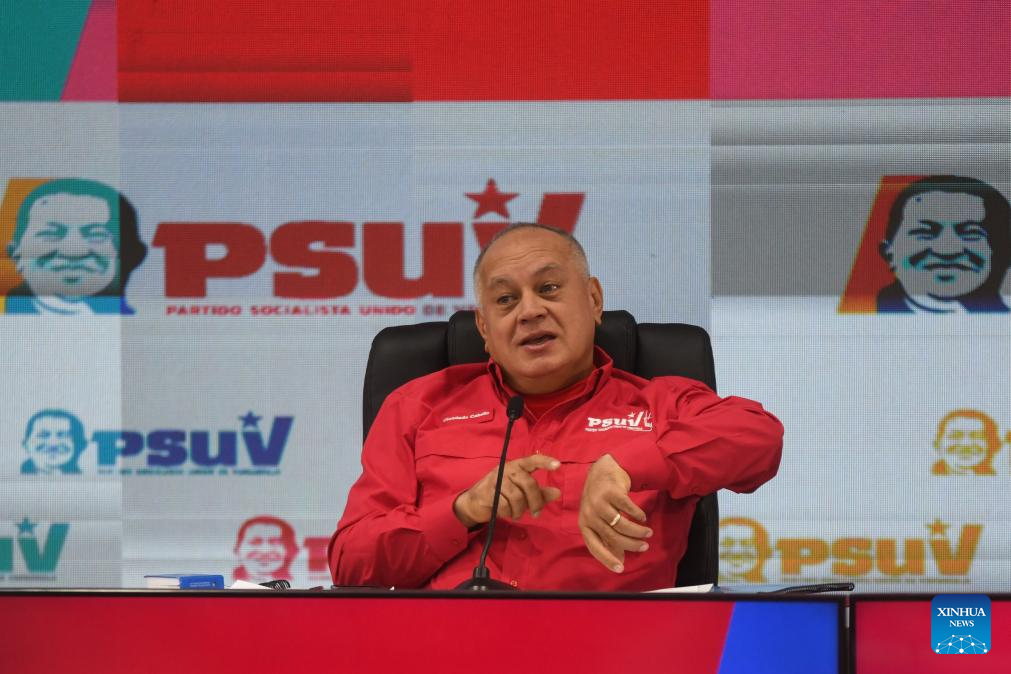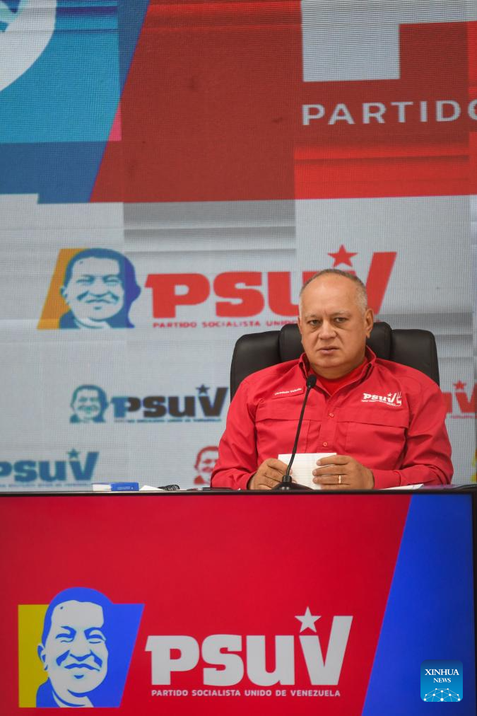 El secretario general del Partido Socialista Unido de Venezuela (PSUV), Diosdado Cabello, asiste a una conferencia de prensa, en el estado de Miranda, Venezuela, el 8 de diciembre de 2025. Cabello agradeció el lunes el respaldo internacional al país sudamericano ante la amenaza militar de Estados Unidos. (Xinhua/Marcos Salgado)
