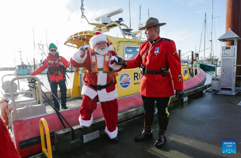 RICHMOND, 8 diciembre, 2025 (Xinhua) -- Imagen del 7 de diciembre de 2025 de un miembro de la Real Policía Montada de Canadá ayudando a un hombre disfrazado de Santa Claus al desembarcar de un bote en Fisherman's Wharf, en la aldea Steveston, Richmond, Columbia Británica, Canadá. El evento de llegada de Santa Claus se celebró aquí el domingo, marcando el inicio de las celebraciones navideñas locales y atrayendo a cientos de residentes para asistir. (Xinhua/Liang Sen)