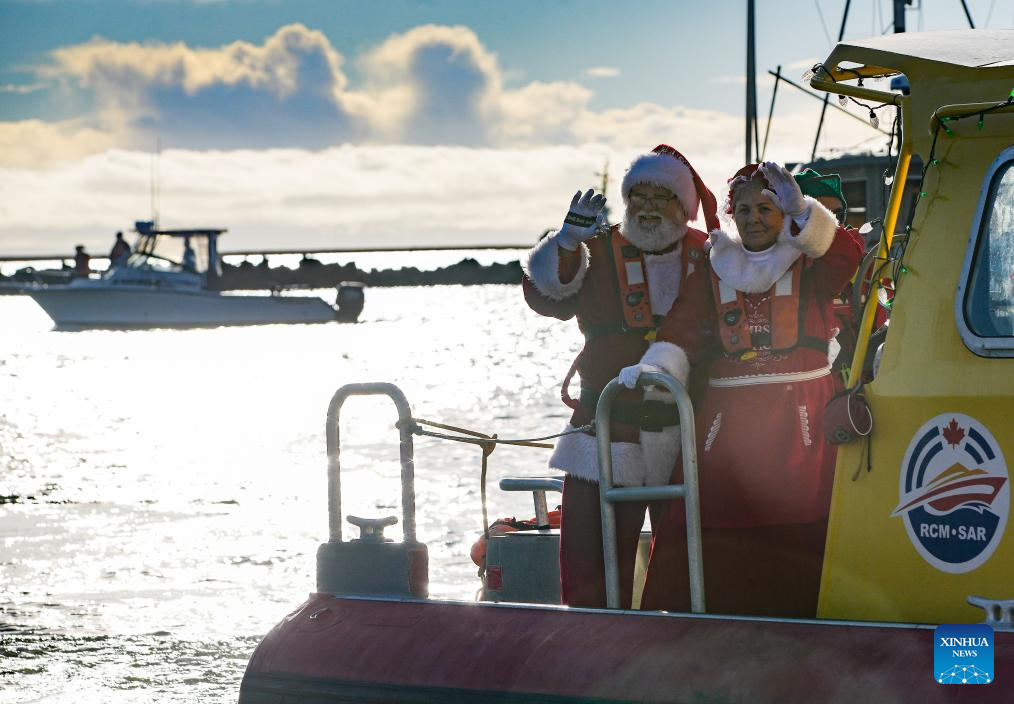 RICHMOND, 8 diciembre, 2025 (Xinhua) -- Imagen del 7 de diciembre de 2025 de dos personas disfrazadas de Santa Claus y la Sra. Claus saludando a la multitud mientras viajan en bote hacia Fisherman's Wharf, en la aldea Steveston, Richmond, Columbia Británica, Canadá. El evento de llegada de Santa Claus se celebró aquí el domingo, marcando el inicio de las celebraciones navideñas locales y atrayendo a cientos de residentes para asistir. (Xinhua/Liang Sen)