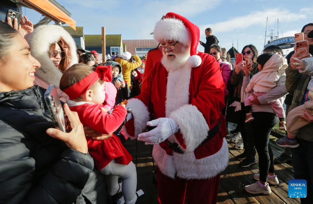 RICHMOND, 8 diciembre, 2025 (Xinhua) -- Imagen del 7 de diciembre de 2025 de un hombre disfrazado de Santa Claus interactuando con un bebé en Fisherman's Wharf, en la aldea Steveston, Richmond, Columbia Británica, Canadá. El evento de llegada de Santa Claus se celebró aquí el domingo, marcando el inicio de las celebraciones navideñas locales y atrayendo a cientos de residentes para asistir. (Xinhua/Liang Sen)