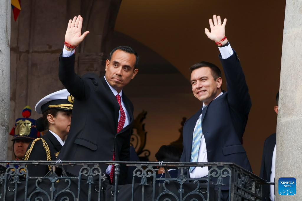QUITO, 12 diciembre, 2025 (Xinhua) -- El presidente ecuatoriano, Daniel Noboa (d), y el presidente peruano, José Jerí (i), saludan en el marco del Encuentro Presidencial e instalación del XVI Gabinete Binacional Ecuador-Perú, en el Palacio de Carondelet, en la ciudad de Quito, capital de Ecuador, el 12 de diciembre de 2025. Noboa y Jerí firmaron el viernes en Quito una declaración conjunta que incluye 57 compromisos políticos y de cooperación en diversos ámbitos, con énfasis en la seguridad y el fortalecimiento del control de las fronteras. (Xinhua/Ricardo Landeta)