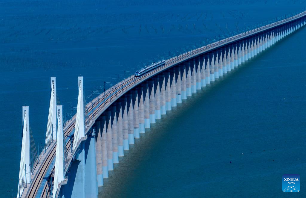 Vista aérea tomada con un dron el 19 de septiembre de 2023 de un tren de pruebas circulando por el puente marítimo de la Bahía de Meizhou a lo largo del ferrocarril de alta velocidad Fuzhou-Xiamen-Zhangzhou, en la provincia de Fujian, en el sureste de China. China, que cuenta con la red ferroviaria de alta velocidad más grande del mundo, ha ampliado su kilometraje operativo total a más de 50.000 kilómetros con el lanzamiento de una nueva línea de alta velocidad. Un tren bala "Fuxing" partió el viernes por la mañana de Yan'an, un lugar sagrado revolucionario en la provincia de Shaanxi, en el noroeste de China, con destino a la capital provincial, Xi'an, inaugurando la nueva ruta. (Xinhua/Wei Peiquan)