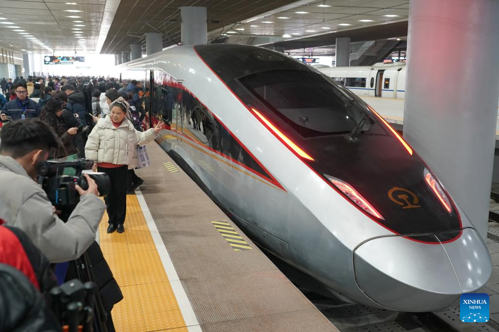 XI'AN, 26 diciembre, 2025 (Xinhua) -- Una pasajera posa para fotografías frente al primer tren de línea ferroviaria de alta velocidad Xi'an-Yan'an con destino a Yan'an, en la Estación de Ferrocarril del Norte de Xi'an, en Xi'an, en la provincia de Shaanxi, en el noroeste de China, el 26 de diciembre de 2025. Un estilizado tren bala plateado partió el viernes de Yan'an, en la provincia noroccidental china de Shaanxi, para conectar así el sagrado corazón revolucionario de China con la red ferroviaria de alta velocidad del país, que se encuentra en rápida expansión. (Xinhua/Shao Rui)